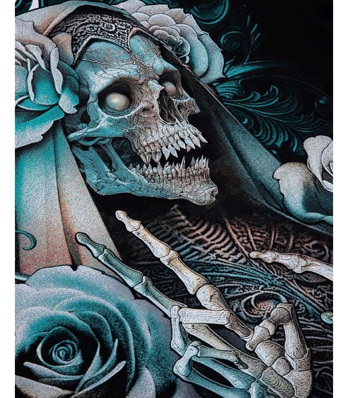 Koszulka Santa Muerte 24 wykonana jest z doskonałej jakości bawełny a jej intensywne nadruki zachwycają pięknymi kolorami. Dodatkowo, znajdziesz na niej stylizowane napisy firmowe w odcieniach turkusu i bieli, dodającym niepowtarzalnego charakteru