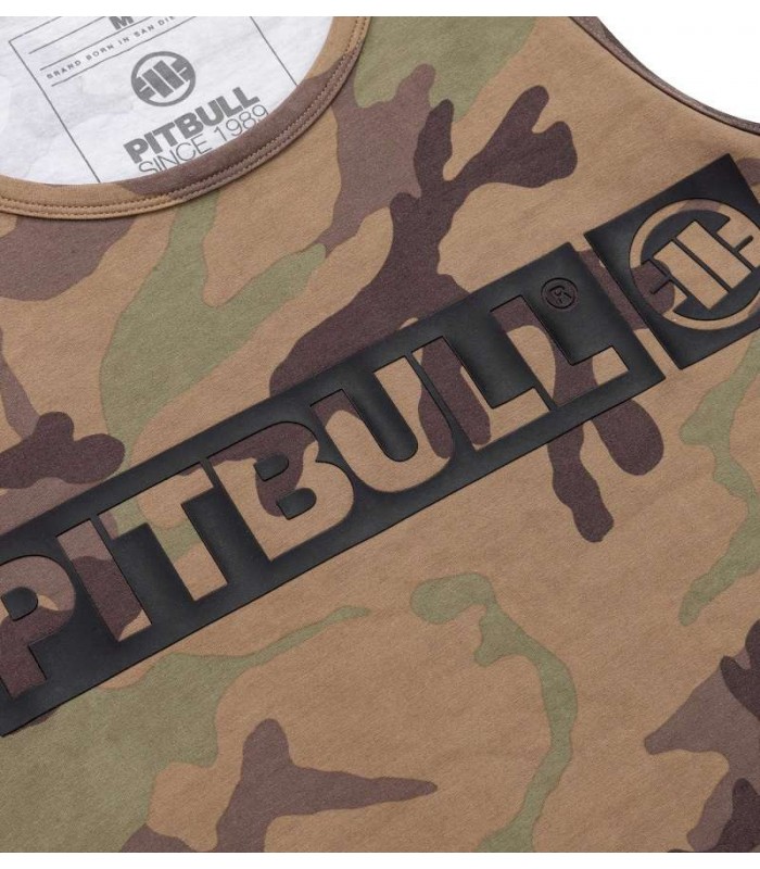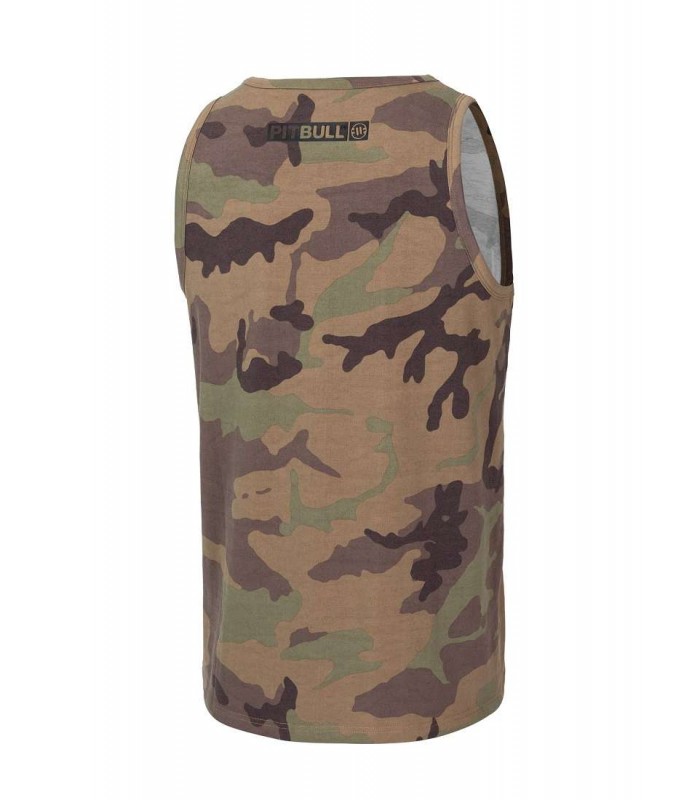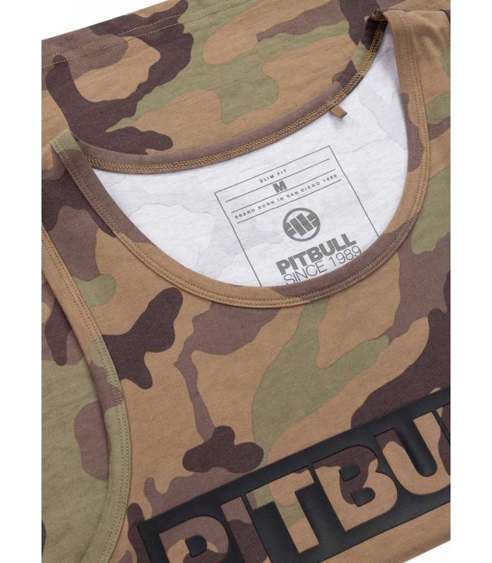 Koszulka Pit Bull męska bez rękawów z serii Slim Fit z gładkiej opinającej ciało bawełny. Tank top model Hilltop posiada ciekawy print w kolorze zielono- brązowego moro. Model Slim fit Hilltop dzięki specjalnej mieszance bawełny ładnie dopasowuje się do ciała i podkreśla sylwetkę oraz jest bardzo komfortowy i nie krępuje ruchów. Koszulka ma krój codzienny - odkrywa ramiona ale nie jest nadmiernie wycięta. Posiada naszywkę z logo firmowym - z przodu przy dolnym obrzeżu, tył koszulki gładki, z tyłu na karku mały nadruk z logo firmowym.