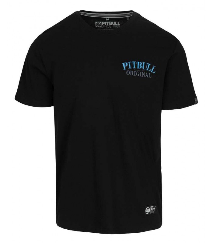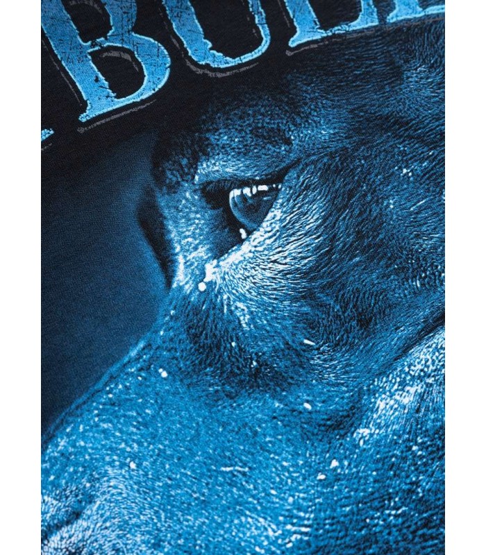 Hitowy model koszulki znów dostępny!! Koszulka w kolorze czarnym z dużym niebieskim nadrukiem psa na plecach. Z przodu niewielki napis Pitbull West Coast w odcieniu błękitu. Naszywki z logo firmowym na rękawku i z przodu przy dolnym obrzeżu. Koszulka męska o klasycznym regularnym kroju z okrągłym kołnierzem. Wysoka jakość materiału i nadruków zapewnia komfort użytkowania a specjalnie dobrany krój i grafika daje świetny wygląd.