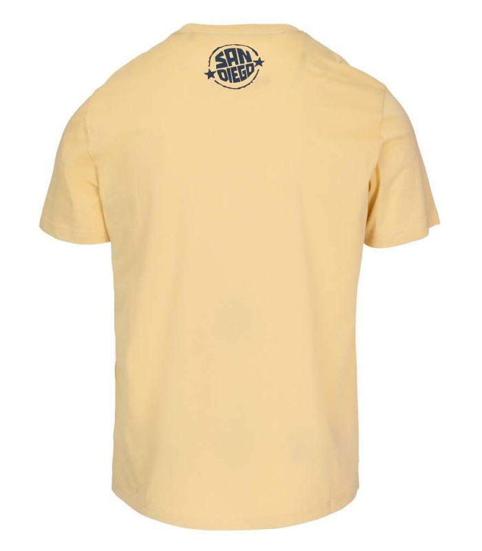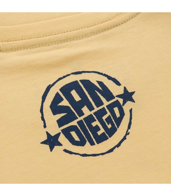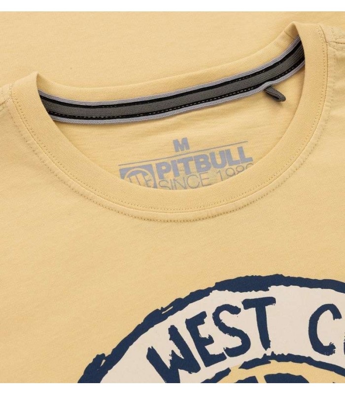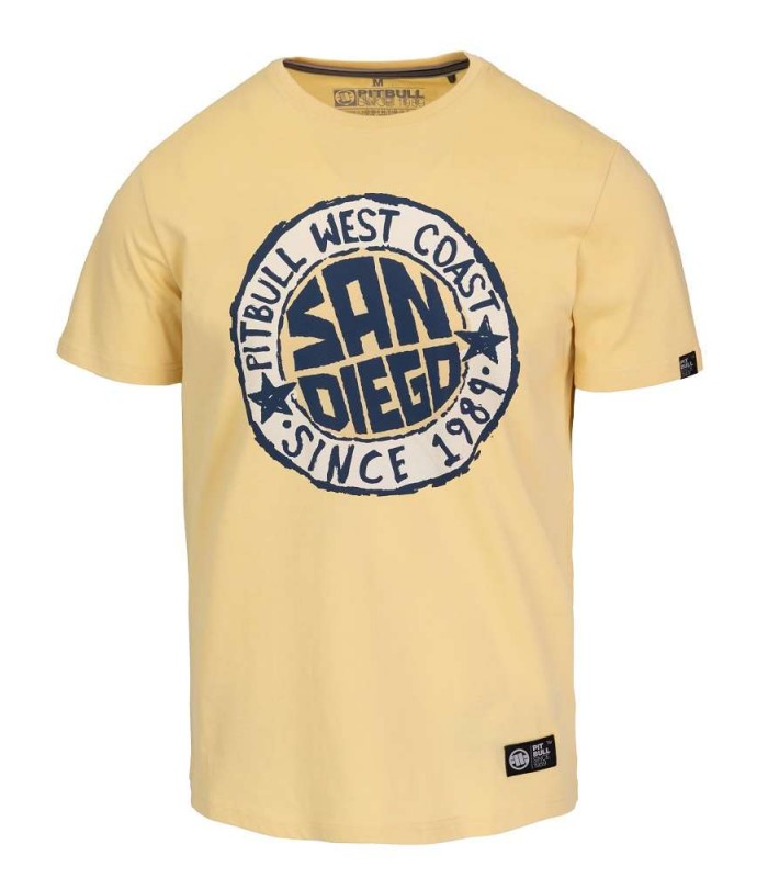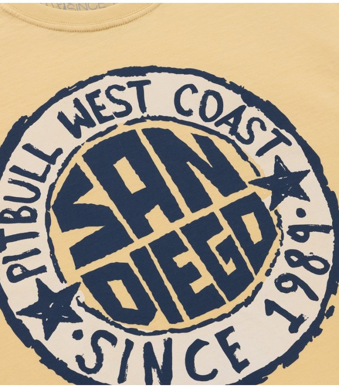 Koszulka męska Pit Bull model San Diego Sun z dużym nadrukiem na piersi w odcieniach niebieskiego przedstawiającym logo w formie pieczęci. Koszulka jest wykonana z wysokiej jakości bawełny, dzięki czemu jest miękka i przyjemna w dotyku. Materiał jest również lekki i przewiewny, co zapewnia komfort noszenia w cieplejsze dni i sprawia, że idealnie nada się na letnie wyjazdy. Koszulka ma gramaturę 170 g/m2, co oznacza, że jest to materiał o średniej grubości, idealny na codzienne noszenie.
