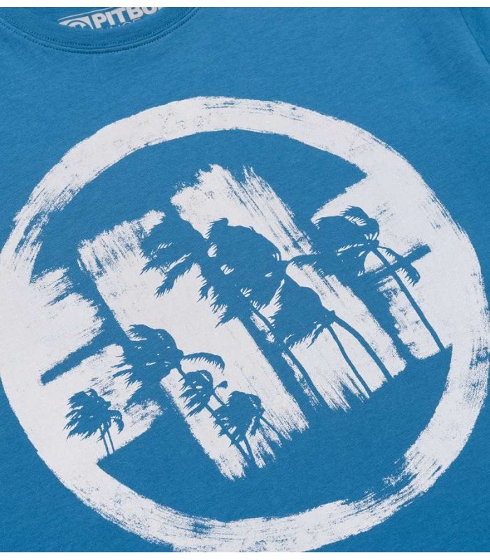 Koszulka męska Pit Bull model Logo Palms z okrągłym nadrukiem logo na piersi nawiązującym do klimatu wakacji. Koszulka Logo Palms jest wykonana z wysokiej jakości bawełny, dzięki czemu jest miękka i przyjemna w dotyku. Materiał jest również lekki i przewiewny, co zapewnia komfort noszenia w cieplejsze dni i sprawia, że idealnie nada się na letnie wyjazdy. Koszulka ma gramaturę 170 g/m2, co oznacza, że jest to materiał o średniej grubości, idealny na codzienne noszenie.