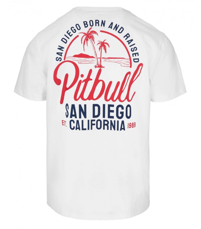 Koszulka męska Pit Bull model San Diego Born z dużym dwukolorowym nadrukiem na plecach przedstawiającym plaże i logo firmowe. Koszulka jest wykonana z wysokiej jakości bawełny, dzięki czemu jest miękka i przyjemna w dotyku. Materiał jest również lekki i przewiewny, co zapewnia komfort noszenia w cieplejsze dni i sprawia, że idealnie nada się na letnie wyjazdy. Koszulka ma gramaturę 170 g/m2, co oznacza, że jest to materiał o średniej grubości, idealny na codzienne noszenie.