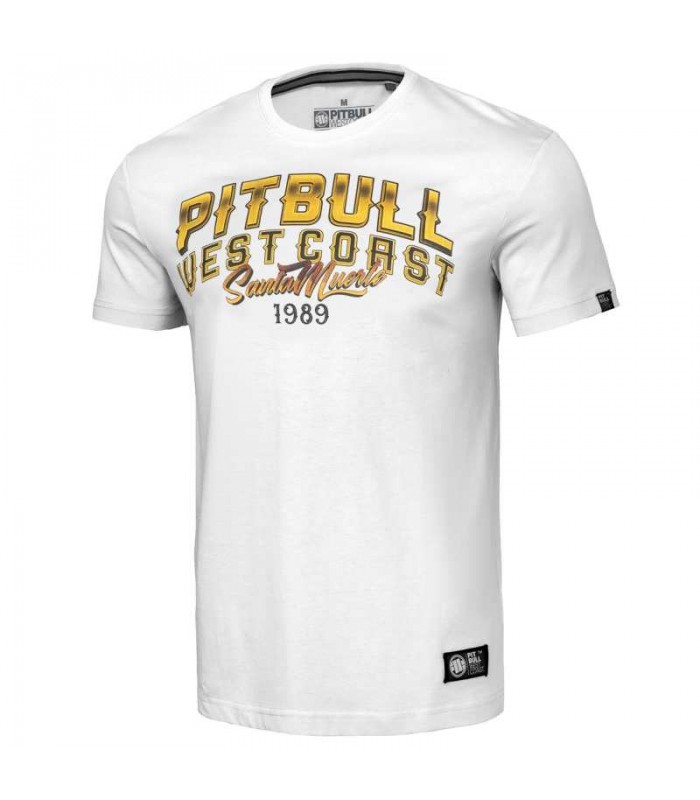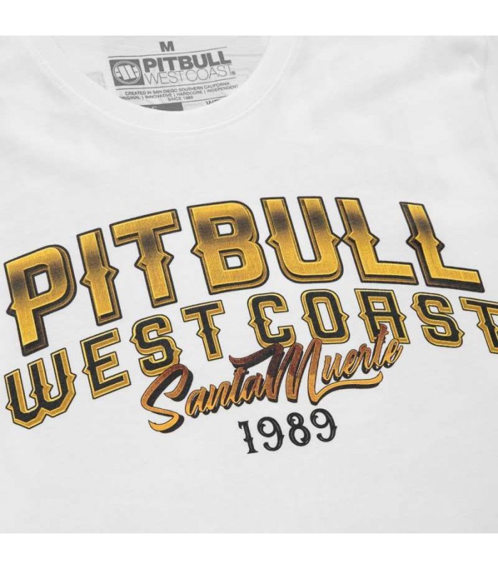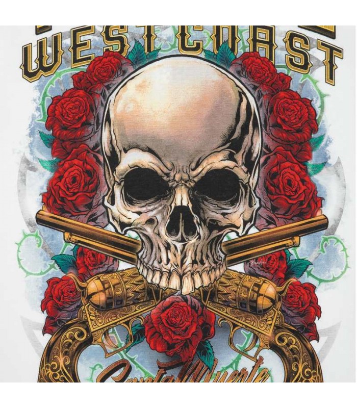 Koszulka męska Santa Muerte Pit Bull West Coast w kolorze białym z kolekcji wiosna lato. Koszulka z serii regular ze zwracającą uwagę grafiką czaszki na tle róż i pistoletów inspirowaną kulturą meksykańską. Z przodu tshirt posiada napisy firmowe w odcieniach beżu i żółci. Koszulka wykonana z dobrej gatunkowo bawełny z wysokiej jakości nadrukami w pięknych intensywnych kolorach. Koszulka Santa Muerte na rekawku i u dołu posiada również tkane metki firmowe oraz lamówkę od wewnętrznej strony na szwie karku chroniąca przed przed otarciami.