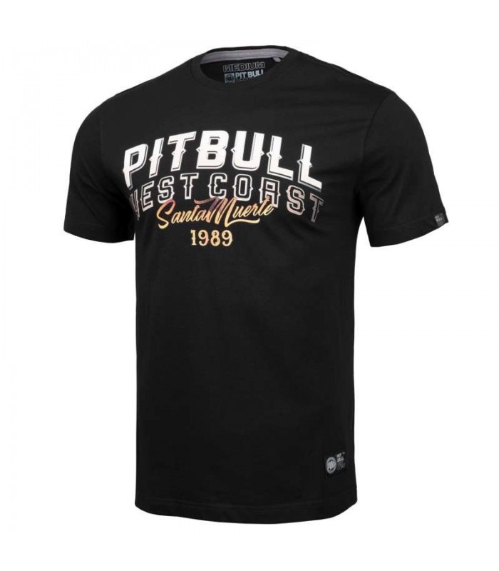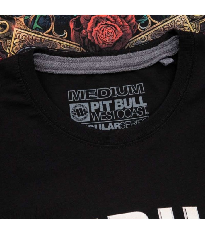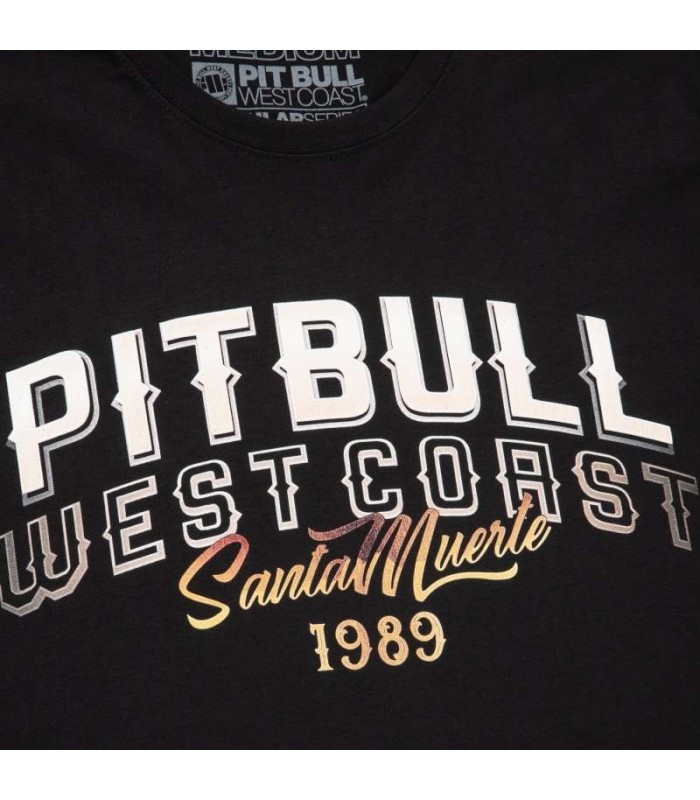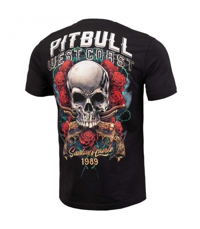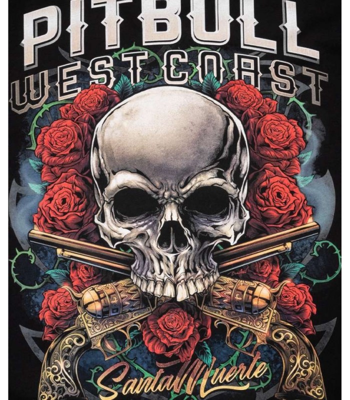 Koszulka męska Santa Muerte Pit Bull West Coast w kolorze czarnym z kolekcji wiosna lato. Koszulka z serii regular ze zwracającą uwagę grafiką czaszki na tle róż i pistoletów inspirowaną kulturą meksykańską. Z przodu t-shirt posiada napisy firmowe w odcieniach beżu. Koszulka wykonana z dobrej gatunkowo bawełny z wysokiej jakości nadrukami w pięknych intensywnych kolorach. Koszulka Santa Muerte na rekawku i u dołu posiada również tkane metki firmowe oraz lamówkę od wewnętrznej strony na szwie karku chroniąca przed przed otarciami.