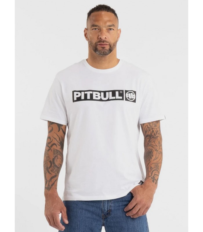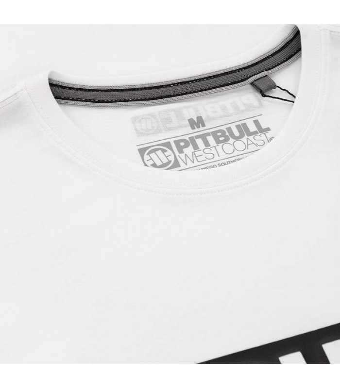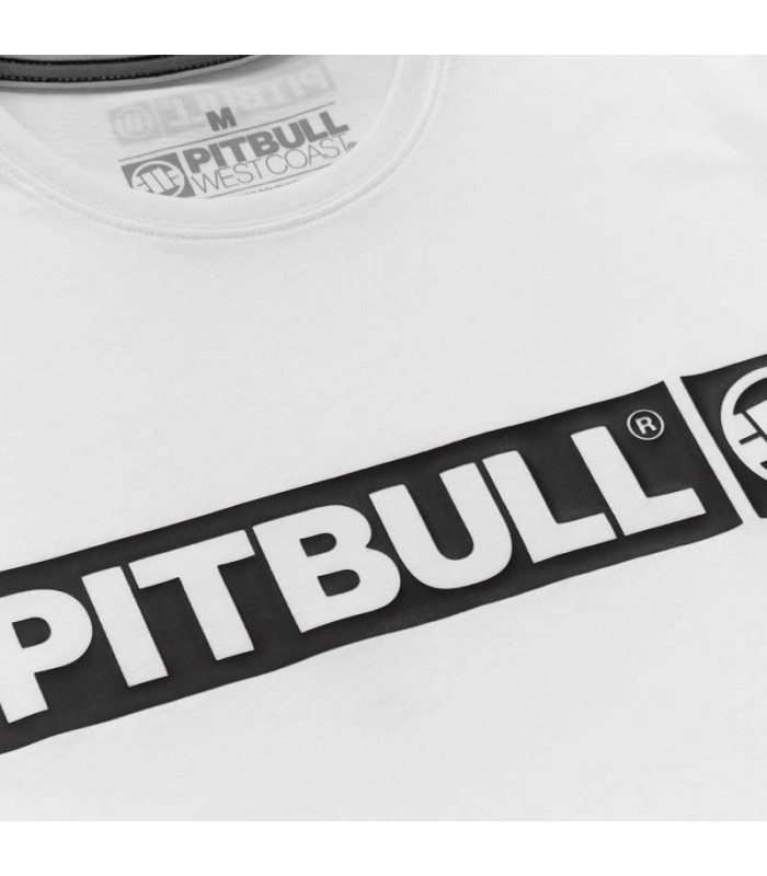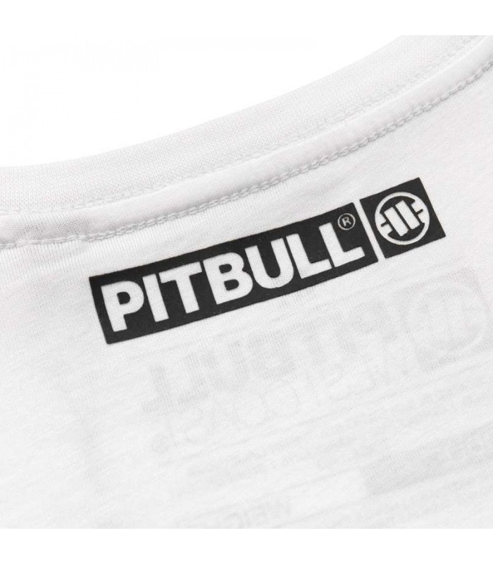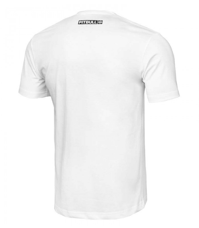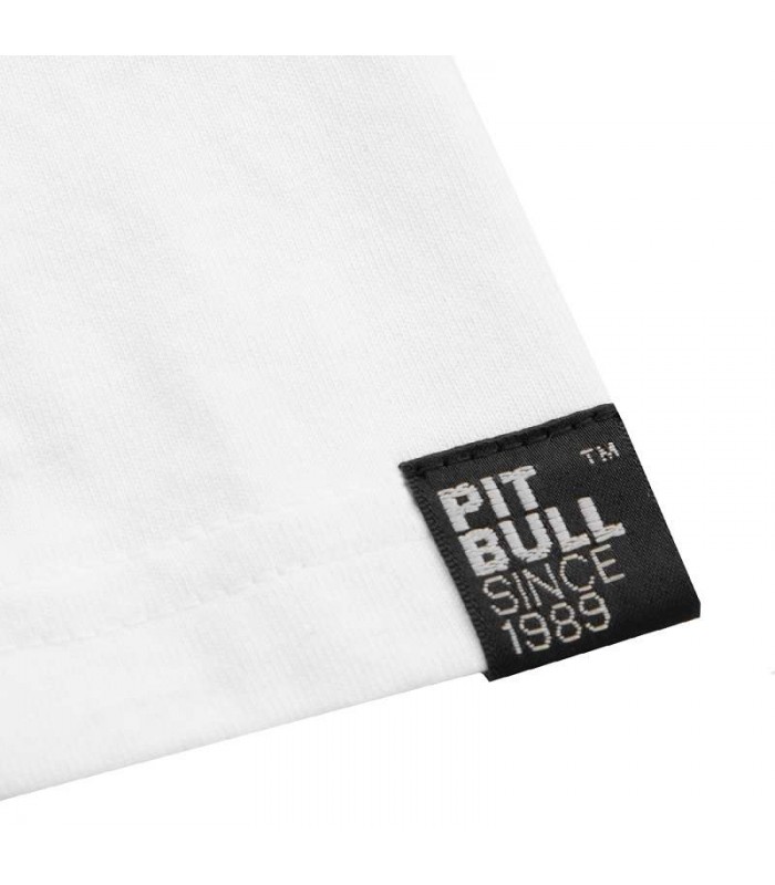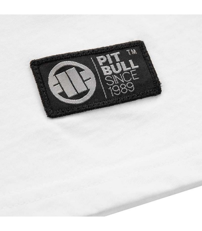 Koszulka Pit Bull model Hilltop w kolorze białym z czarnym napisem na piersi. Nadruk na koszulce przedstawia logo firmy Pit Bull, który łączy się w jeden element graficzny. Nadruk ten wykonany jest w gumie, co dodaje koszulce elegancki i nowoczesny wygląd. Koszulka Hilltop jest wykonana z wysokiej jakości bawełny, dzięki czemu jest miękka i przyjemna w dotyku. Materiał jest również lekki i przewiewny, co zapewnia komfort noszenia w cieplejsze dni. Koszulka ma gramaturę 170 g/m2, co oznacza, że jest to materiał o średniej grubości, idealny na codzienne noszenie.