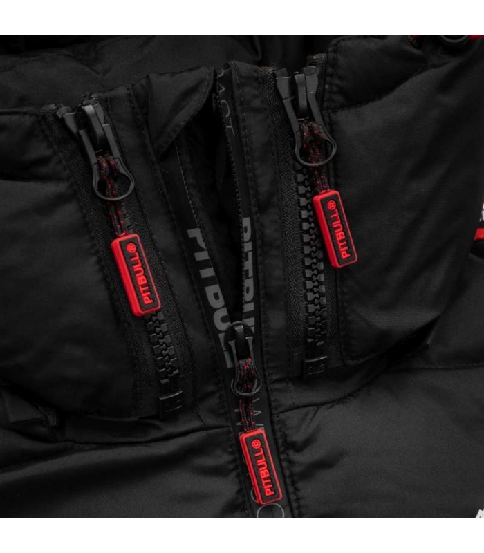 Na przodzie od zewnętrznej strony dwie zapinane na ukryty zamek kieszenie natomiast od strony wewnętrznej jedna kieszeń zapinana na zatrzask. Kurtka posiada ciekawe detale takie jak ozdobne żakardowe taśmy na całej długości rękawów, powlekany zamek z nadrukiem firmowym, gumowane uchwyty mniejszych zamków, na wysokości lewej piersi i prawej łopatki białe nadruki PITBULL Snow Crew. Całość utrzymana w tonacji czerni z biało- czerwonymi dodatkami.