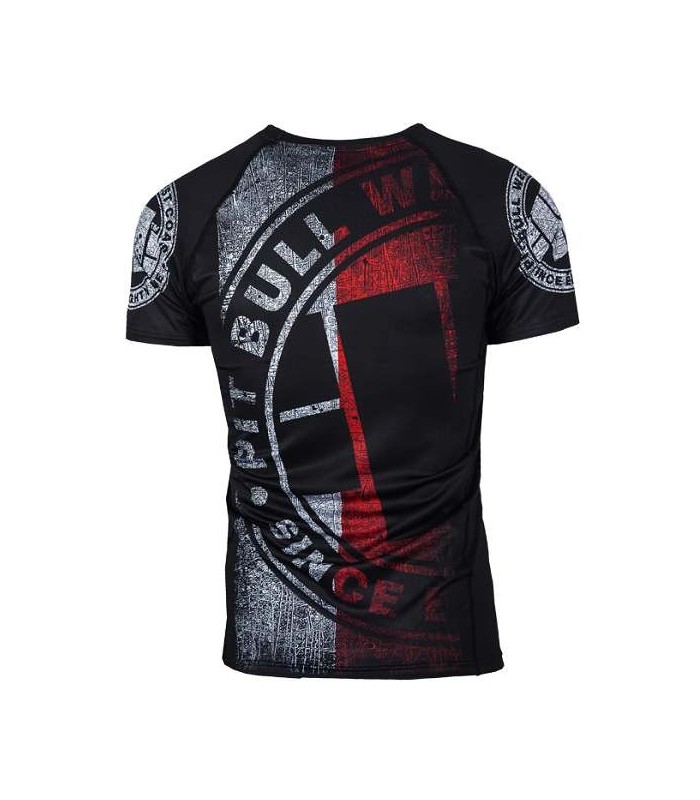 Prezentowany model nawiązuje do naszych barw narodowych – biało-czerwona flaga zamieszczona na plecach i wyeksponowany napis Pit Bull Polska na frontowej części koszulki doskonale sygnalizują, iż jej posiadacz jest mocno związany z ojczyzną i manifestacja tego koszulką jest tylko jedną z oznak tego, jak bardzo ten kraj jest ważny. Prezentowany rashguard Pit Bull wykonany jest z materiałów wysokiej jakości, zapewniających odpowiednie odprowadzanie potu i wentylowanie skóry. Udaje się w ten sposób uniknąć przegrzania organizmu, co podczas intensywnego treningu może stanowić spore zagrożenie. Wzory graficzne zostały naniesione metodą sublimacji termicznej, co powinno zagwarantować trwałość nadruku i długą żywotność, również podczas codziennego użytkowania i częstego prania. Co również jest istotne – odpowiednie materiały gwarantują szybkie schnięcie jak i ochronę przeciwbakteryjną.